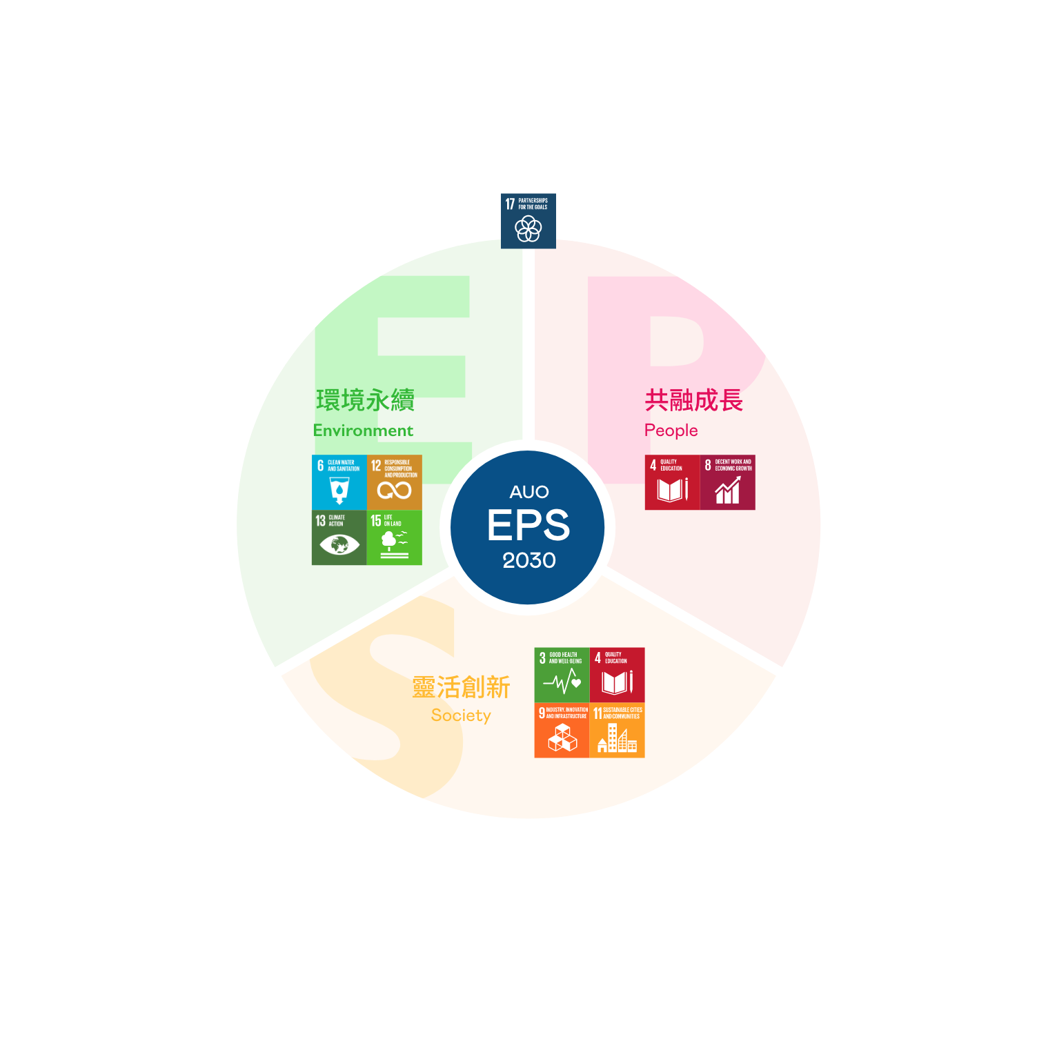 接軌聯合國SDGs永續發展目標,友達光電以「超越企業社會責任,創造共享價值」為願景,訂出EPS三大永續發展主軸,並延伸訂定具體目標引領行動,擘劃企業永續策略路徑。